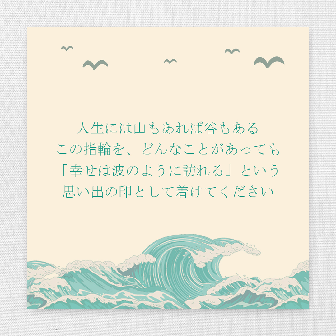 「山あり谷ありリング」は、人生の浮き沈みをそっと見守り、支えてくれる特別なリングです。緩やかなカーブのデザインは、山を越え谷を越える日々をやさしく象徴しています。幸せは必ず波のように訪れる――そんな願いを込めて、大切な思い出のお守りとして身につけていただけます。困難な時も、喜びの時も、そっと寄り添う存在になりますように。