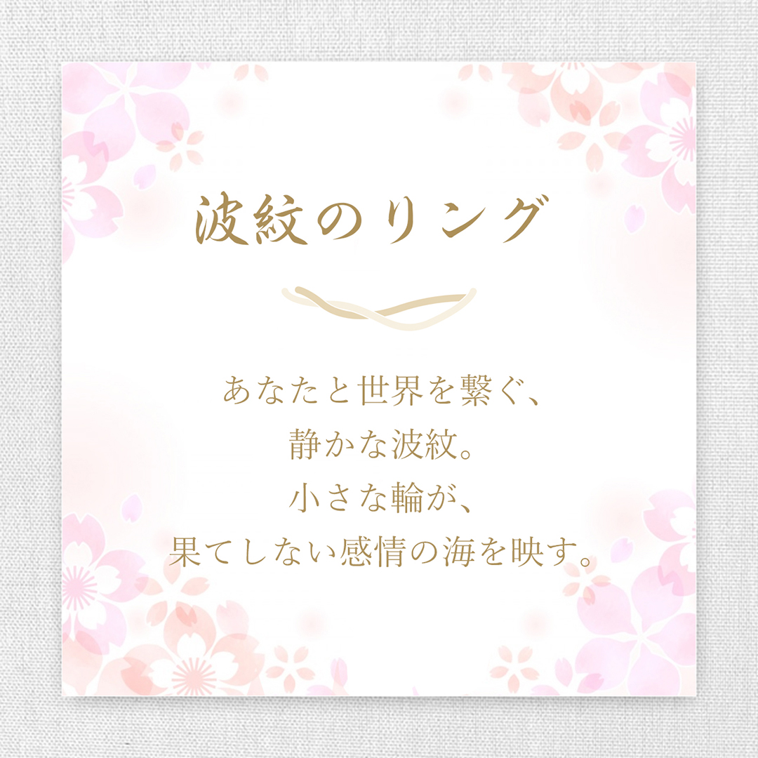 指先に広がる、静かな波紋。それはあなたの心と世界をそっと繋ぐ小さな印。感情の余韻がそっと揺れるような、穏やかな存在感のあるリングです。