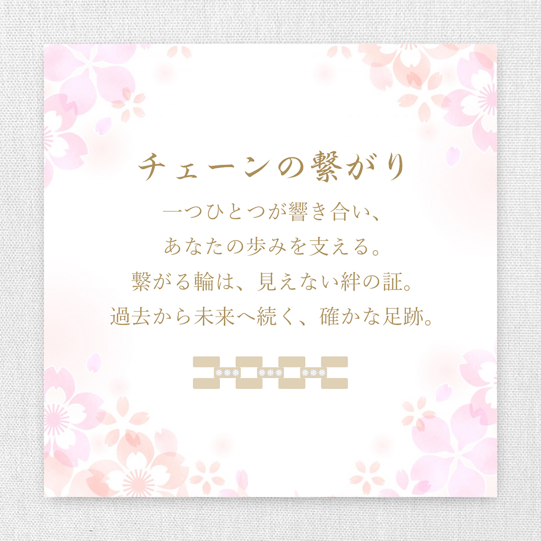 チェーンの繋がり、一つひとつが響き合い、あなたの歩みを支える。繋がる輪は、見えない絆の証。過去から未来へ続く、想いを込めたリング。