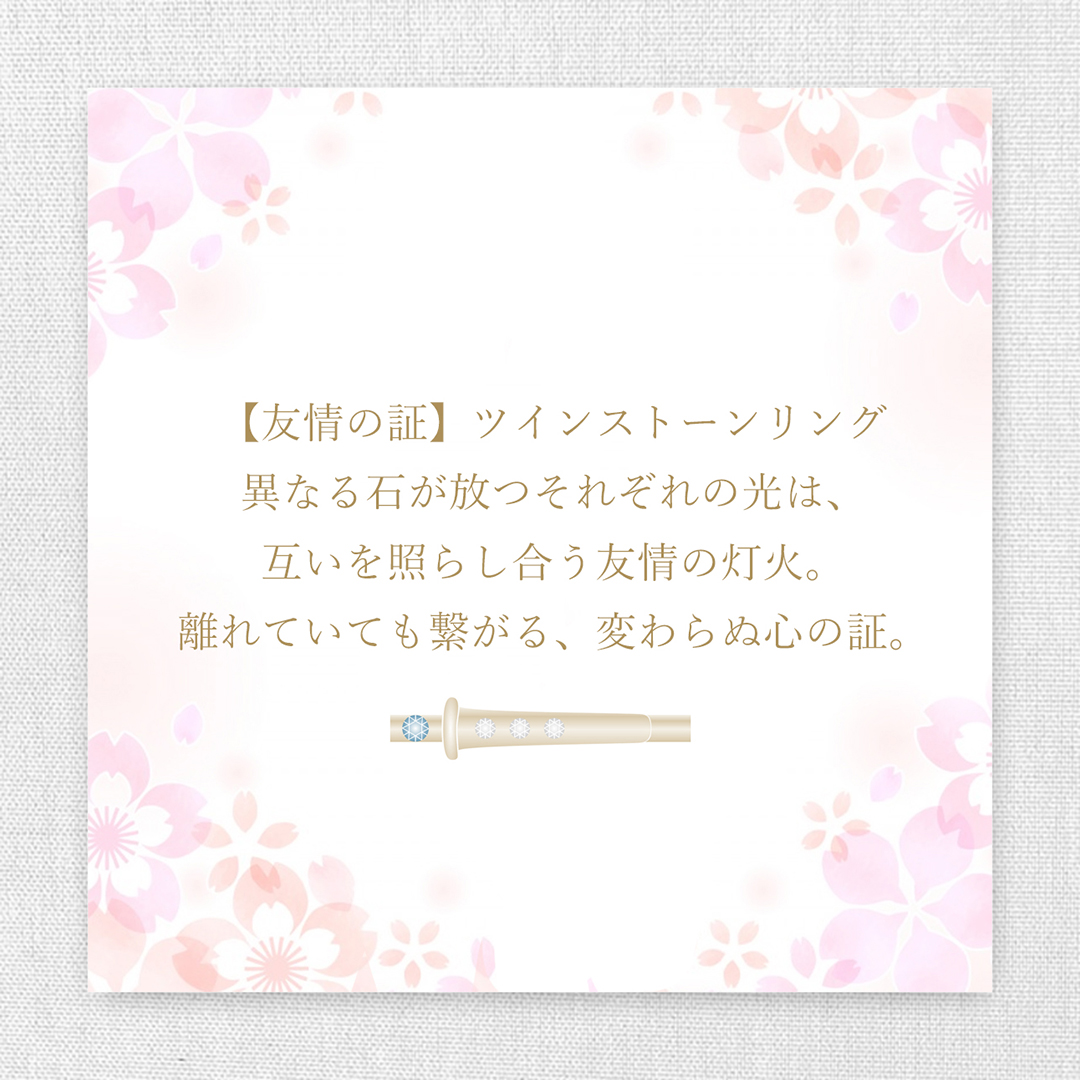 異なる石が放つそれぞれの光は、互いを照らし合う友情の灯火。離れていても心はひとつ。変わらぬ絆をそっと刻むツインストーンのリング。